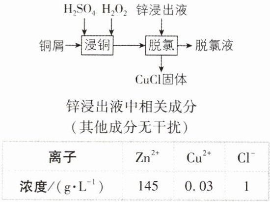 C 命题点·工艺流程分析,涉及试剂量、离子方程式判断等\n**流程分析**:浸铜:“浸铜”时反应为Cu + H₂O₂ + 2H⁺ = Cu²⁺ + 2H₂O,反应后溶液中的主要离子为Cu²⁺、SO₄²⁻、H⁺;……B错误。脱氯:由题给信息可知,“脱氯”步骤仅Cu元素化合价发生改变,反应为Cu + Cu²⁺ + 2Cl⁻ = 2CuCl,此反应需Cu参与,故“浸铜”时Cu应有剩余,H₂O₂应适量;……A错误、C正确。脱氯液:“脱氯”后脱氯液中金属离子主要为Zn²⁺,电解时,Zn²⁺得电子生成Zn,是还原反应,则阴极得到Zn。……D错误。