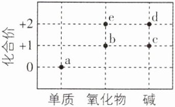B 命题点·Na和Cu元素及其化合物的性质\n**思路导引**:由物质类别及元素的化合价可推知:a是Na或Cu,b是Na₂O、Na₂O₂或Cu₂O,e是CuO,c是NaOH或CuOH,d是Cu(OH)₂。\n**解析**:2NaOH + CuCl₂ = 2NaCl + Cu(OH)₂↓或4CuOH + O₂ + 2H₂O = 4Cu(OH)₂、Cu(OH)₂△= CuO + H₂O,A正确;Na、Na₂O、Na₂O₂都能与H₂O反应生成NaOH,B错误;新制Cu(OH)₂可用于检验醛基(有砖红色沉淀生成),C正确;Na₂O₂能与H₂O反应生成NaOH和O₂,而Na₂O和Cu₂O不能与水反应生成O₂,说明此时b是Na₂O₂,Na₂O₂中含有离子键和共价键,D正确。
