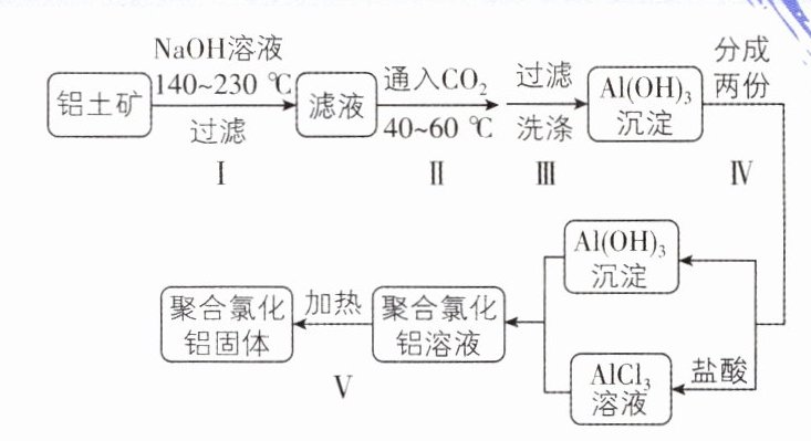 (2)** 步骤Ⅰ需要将溶液温度升至140 - 230℃,在密闭耐高压容器中可实现,A正确;步骤Ⅱ滤液中通入过量CO₂,发生反应Na[Al(OH)₄] + CO₂ = Al(OH)₃↓ + NaHCO₃,若Na[Al(OH)₄]浓度较大,生成的NaHCO₃(常温下溶解度较小)可能会析出,使得Al(OH)₃沉淀中的杂质较多,B错误;洗涤沉淀时,不能对漏斗中的沉淀搅拌,以防把滤纸搅破,C错误;聚合氯化铝由Al(OH)₃和AlCl₃按一定比例聚合而成,控制Al(OH)₃和AlCl₃的投料比可控制产品的盐基度,D正确。\n**