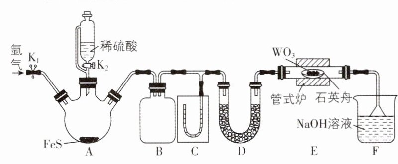 (1)先用氩气排出装置内的空气,待$WO_{3}$加热后再通入$H_{2}S$气体,$WO_{3}$和$H_{2}S$在加热条件下发生反应$WO_{3}+3H_{2}S\stackrel{\triangle}{=\!=\!=}WS_{2}+3H_{2}O+S$,从而制备$WS_{2}$,所以操作(ⅱ)为加热管式炉至一定温度;A 中$FeS$与稀硫酸反应生成$FeSO_{4}$和$H_{2}S$,发生反应的离子方程式为$FeS + 2H^{ + }=H_{2}S\uparrow + Fe^{2 + }$。