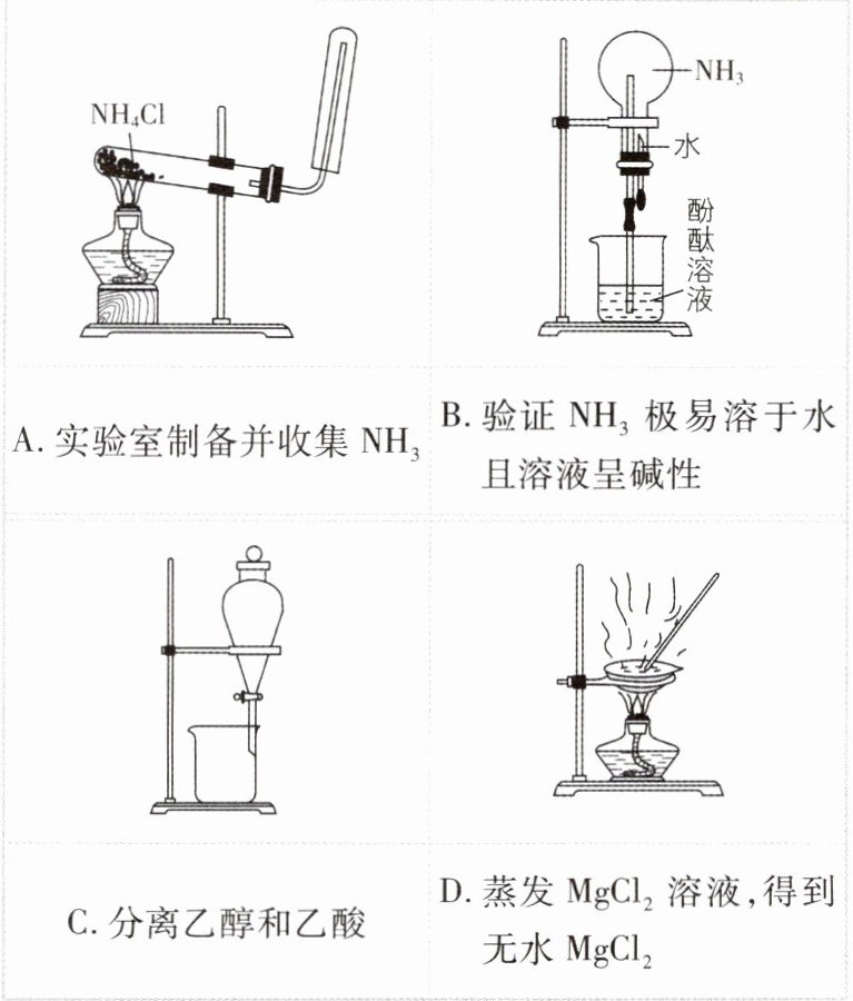 【解析】氯化铵受热分解生成氯化氢和氨气,氯化氢和氨气在试管口遇冷又重新反应生成氯化铵,则直接加热氯化铵不能制备氨气,A错误;挤压胶头滴管,使水进入烧瓶,氨气极易溶于水,能使烧瓶中的气体压强骤减而产生喷泉,氨气与水反应生成的一水合氨能电离出氢氧根离子,使溶液呈碱性,从而产生红色喷泉,所以能用喷泉实验验证氨气极易溶于水且溶液呈碱性,B正确;乙醇和乙酸互溶,不能用分液的方法分离乙醇和乙酸,应采用加入生石灰后蒸馏的方法分离,C错误;氯化镁是强酸弱碱盐,在溶液中水解生成氢氧化镁和氯化氢,直接加热蒸发氯化镁溶液,氯化氢挥发,会使水解平衡趋于完全得到氢氧化镁,无法得到无水氯化镁,D错误。