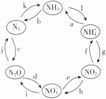 【解析】氮的固定指由游离态的氮转化为氮的化合物的过程,图中属于氮的固定的是“反应c”和“反应k”,A错误;没有元素化合价变化的反应属于非氧化还原反应,则转化过程中发生非氧化还原反应为“反应a”和“反应l”,B错误;“反应h”发生反应$3\mathrm{NO}_{2}+\mathrm{H}_{2}\mathrm{O}=2\mathrm{HNO}_{3}+\mathrm{NO}$,$\mathrm{HNO}_{3}$为氧化产物,$\mathrm{NO}$为还原产物,氧化产物与还原产物的物质的量之比为$2:1$,C错误;$\mathrm{NO}_{2}$能与$\mathrm{NaOH}$发生反应:$2\mathrm{NO}_{2}+2\mathrm{NaOH}=\mathrm{NaNO}_{2}+\mathrm{NaNO}_{3}+\mathrm{H}_{2}\mathrm{O}$,工业上可以用氢氧化钠溶液吸收$\mathrm{NO}_{2}$,D正确。