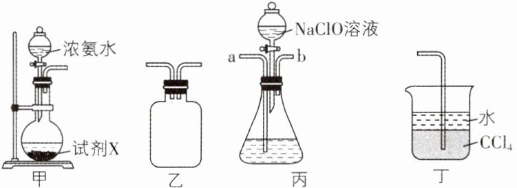 【解析】碱石灰吸水放热,同时产生碱,可降低氨气的溶解度,则装置甲中试剂X可以选择碱石灰来制取$\mathrm{NH}_{3}$,A正确;装置乙中进气和出气导管都较短,不能发生倒吸,可作为反应过程的安全瓶,B正确;操作过程中若快速滴加$\mathrm{NaClO}$溶液,可能会导致部分水合肼被$\mathrm{NaClO}$进一步氧化,从而降低水合肼的产率,C错误;$\mathrm{NH}_{3}$难溶于$\mathrm{CCl}_{4}$而极易溶于水,故可用装置丁吸收反应中过量的$\mathrm{NH}_{3}$,并能防倒吸,D正确。