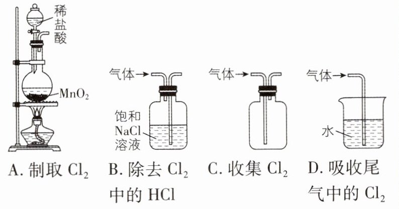 【解析】实验室使用MnO₂与浓盐酸在加热条件下制取Cl₂,A错误;饱和NaCl溶液可除去Cl₂中的HCl,但气体通入洗气瓶应长管进短出,B错误;Cl₂密度比空气大,所以采用向上排空气法收集,C正确;处理尾气中的Cl₂应使用NaOH溶液,D错误。