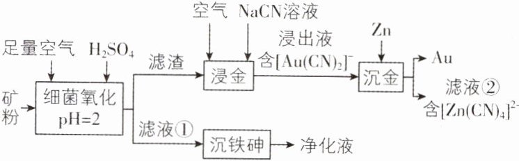 1. [黑吉辽 2024·16,14 分]中国是世界上最早利用细菌冶金的国家。已知金属硫化物在“细菌氧化”时转化为硫酸盐,某工厂用细菌冶金技术处理载金硫化矿粉(其中细小的$Au$颗粒被$FeS_{2}$、$FeAsS$包裹),以提高金的浸出率并冶炼金,工艺流程如下: