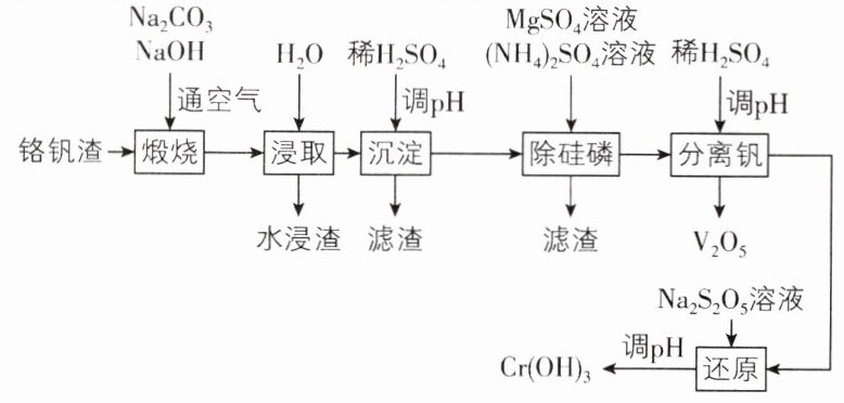 (6) 焦亚硫酸钠中硫元素化合价为+4价,具有还原性,分离钒步骤中调节pH至1.8左右,溶液呈酸性,铬元素以Cr₂O₇²⁻形式存在,Cr₂O₇²⁻具有强氧化性,故焦亚硫酸钠作还原剂,将Cr₂O₇²⁻还原为Cr³⁺[调pH后形成Cr(OH)₃],自身被氧化为SO₄²⁻,根据得失电子守恒、电荷守恒和原子守恒,即可写出该反应的离子方程式。