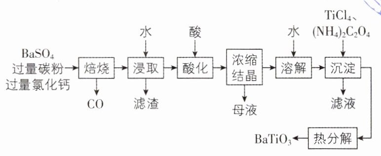 思路导引 由流程和题中信息可知,$BaSO_{4}$与过量的碳粉及过量的氯化钙在高温下焙烧得到$CO$、$BaCl_{2}$、易溶于水的$BaS$和微溶于水的$CaS$;烧渣经水浸取后过滤,滤渣中主要有碳粉和$CaS$,滤液中溶质的主要成分为$BaS$和$BaCl_{2}$;滤液经酸化后浓缩结晶得到$BaCl_{2}$晶体;$BaCl_{2}$晶体溶于水后,加入$TiCl_{4}$和$(NH_{4})_{2}C_{2}O_{4}$将钡离子充分沉淀得到$BaTiO(C_{2}O_{4})_{2}$;$BaTiO(C_{2}O_{4})_{2}$经热分解得到$BaTiO_{3}$。