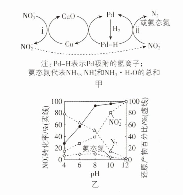 7. [山东临沂 2024 二模]一种以$Pd - Cu$为催化剂还原去除水体中$NO_{3}^{-}$的机理如图甲所示;其他条件相同,pH 不同时,$NO_{3}^{-}$转化率和不同产物在总还原产物中所占的物质的量的百分比如图乙所示。