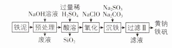 (6)取少许滤液于试管中,向其中滴加稀硝酸酸化,再滴加硝酸银溶液,若有白色沉淀产生,则说明待测液中含有$Cl^{-}$ 创新点·制取黄钠铁矾的工艺流程分析 思路导引 预处理阶段加入$NaOH$溶液除去铁泥表面中的油污,然后加入稀硫酸,酸溶后的酸性溶液中含有$Fe^{2 + }$,过滤分离出的滤渣为$SiO_{2}$,加入$NaClO$将亚铁离子氧化成铁离子,再加入碳酸钠、硫酸钠溶液使铁离子全部沉淀生成黄钠铁矾。 【解析】