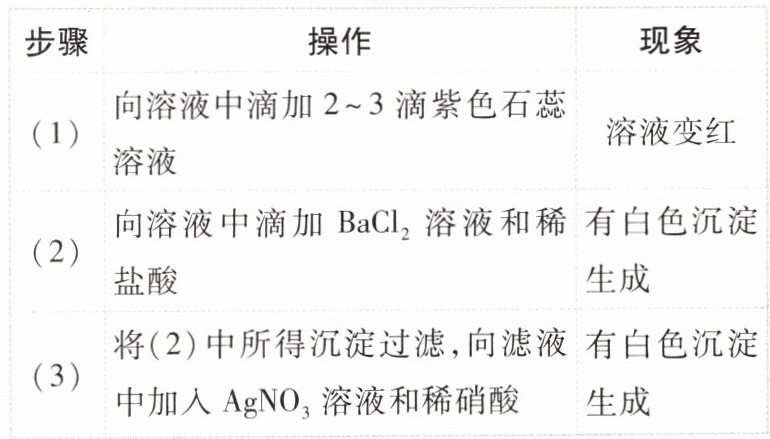 (2)向溶液中滴加$BaCl_{2}$溶液和稀盐酸,有白色沉淀生成,白色沉淀只能为$BaSO_{4}$,溶液一定含有$SO_{4}^{2-}$;