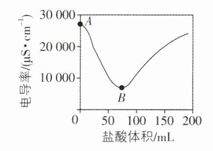 (2)A - B段溶液的电导率逐渐减小,$Ba(OH)_{2}$与盐酸反应,溶液体积变大使溶液中离子浓度降低,反应的离子方程式为$H^{+}+OH^{-}=H_{2}O$。
