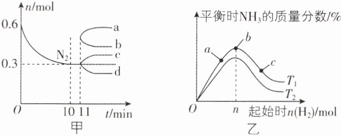 【解析】图甲中,0 - 10 min内氮气的物质的量改变量为0.3 mol,则氢气的物质的量改变量为0.9 mol,该反应的平均速率$v({H_{2}})=\frac{0.9\ mol}{1\ L×10\ min}=0.09\ mol·L^{-1}·min^{-1}$,A错误;图甲中,11 min时,其他条件不变,压缩容器容积,压缩瞬间,氮气的物质的量不变,压强增大,平衡正向移动,氮气的物质的量减小,因此$n({N_{2}})$的变化曲线为d,B错误;图乙中,起始时${H_{2}}$越多,平衡时氮气的转化率越大,因此$a$、$b$、$c$三点所处的平衡状态中,${N_{2}}$的转化率最高的是$c$点,C错误;图乙表示在恒温恒容下,初始投料0.6 mol ${N_{2}}$,当$\frac{n({N_{2}})}{n({H_{2}})}=\frac{1}{3}$时,平衡时${NH_{3}}$的质量分数最大,则$n = 1.8$,D正确。