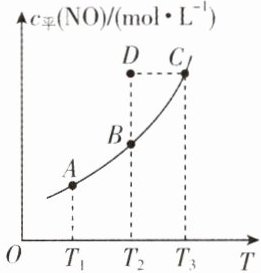 【解析】该反应是反应前后气体体积不变的反应,增大压强平衡不移动,在$T_{1}$时达到平衡,再向体系中充入${NO}$,达到新平衡时,${NO}$体积分数不变,A错误;$T_{2}$时由$D→B$点需降低${NO}$的浓度,即反应正向进行,所以$D$点对应体系中$v(正)>v(逆)$,B错误;由于反应物${C}$为固体,故容积不变时,反应后气体质量增大,混合气体的密度增大,当密度不再变化时,可以判断反应达到平衡状态,C正确;由图像可知,$T_{1}<T_{2}$,升高温度$c_{平}({NO})$增大,平衡左移(吸热方向),所以$\Delta H<0$,$K_{1}>K_{2}$,D错误。