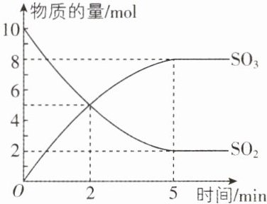 【解析】该反应为可逆反应,2 min后反应物仍减少,生成物仍增多,反应未达到平衡状态,5 min时达到平衡状态,A错误;题中未给出氧气的物质的量,无法计算该反应的平衡常数,当${SO_{2}}$、${O_{2}}$和${SO_{3}}$的物质的量浓度之比为$2:1:2$时,反应可能达到了化学平衡状态,也可能没有达到化学平衡状态,B错误;反应开始至5 min末,按定义计算可得平均反应速率$v({SO_{2}})=\frac{8\ mol}{2\ L×5\ min}=0.8\ mol·L^{-1}·min^{-1}$,C正确;通过调控反应条件,可以提高该反应进行的程度,如增加${O_{2}}$的量可以使得${SO_{2}}$的平衡转化率高于80%,D错误。