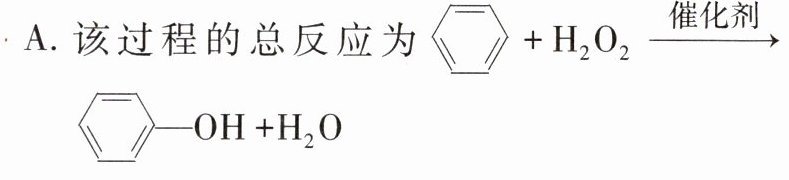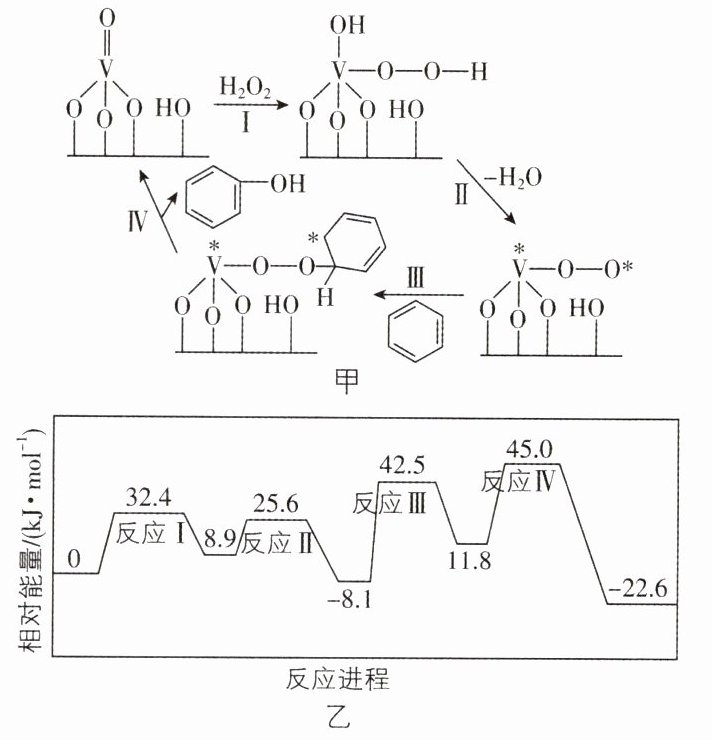 【解析】根据反应机理可知苯和过氧化氢在催化剂作用下生成苯酚和水:$\bigcirc+H_{2}O_{2}\xrightarrow{催化剂}\bigcirc - OH + H_{2}O$,A正确;该过程中有$O - O$非极性键的断裂与苯酚中$C - C$非极性键的形成,B正确;根据反应机理可知,V形成的共价键数目发生变化,该催化循环中V元素的化合价发生了改变,C错误;根据反应进程可知,该过程中反应Ⅲ的活化能最大,该过程的总反应速率由反应Ⅲ决定,D正确。