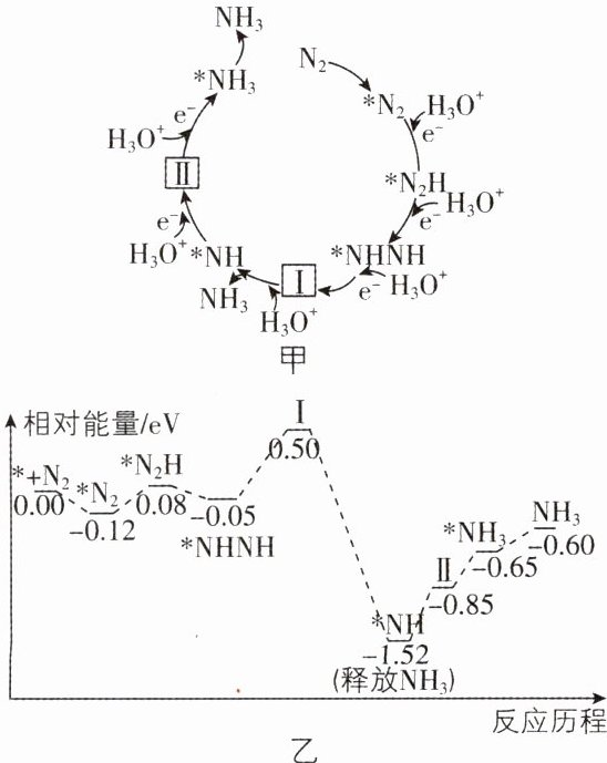 【解析】$^{\cdot}N_{2}\rightarrow^{\cdot}N_{2}H$过程中发生$N - N$非极性键的断裂,无非极性键的形成,A错误;生成Ⅰ的方程式为$^{\cdot}NHNH + H_{3}O^{+}+e^{-}\rightarrow^{\cdot}NHNH_{2}+H_{2}O$,Ⅰ表示的微粒符号是$^{\cdot}NHNH_{2}$,Ⅰ转化为$^{\cdot}NH$和$NH_{3}$的方程式为$^{\cdot}NHNH_{2}+H_{3}O^{+}+e^{-}\rightarrow^{\cdot}NH + NH_{3}+H_{2}O$,过程中可能会生成$N_{2}H_{4}$,B正确;生成Ⅱ的方程式为$^{\cdot}NH + H_{3}O^{+}+e^{-}\rightarrow^{\cdot}NH_{2}+H_{2}O$,Ⅱ表示的微粒符号是$^{\cdot}NH_{2}$,C错误;由图乙可知,反应历程中放热最多的反应是Ⅰ和$H_{3}O^{+}$、$e^{-}$的反应,方程式为$^{\cdot}NHNH_{2}+H_{3}O^{+}+e^{-}\rightarrow^{\cdot}NH + NH_{3}+H_{2}O$,D错误。