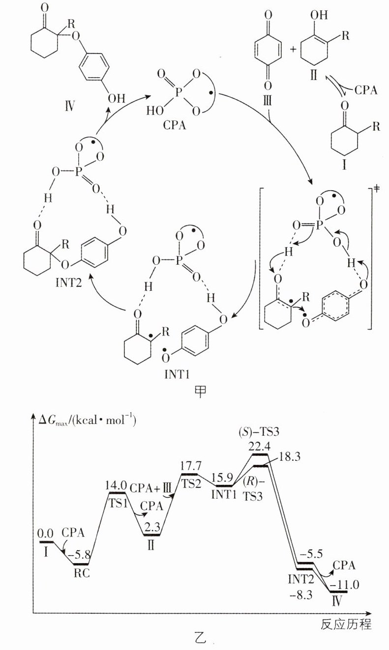 7. [湖南九校联盟 2024 联考]湖南大学某课题组提出了手性磷酸(CPA)催化的环酮和 1,4 - 苯醌的$\alpha -$氧化反应合理的反应路径模型(如图甲所示)和相应的吉布斯自由能曲线图(如图乙所示,TS 表示过渡态,RC 表示反应过程中的中间产物)。下列说法正确的是 ( )