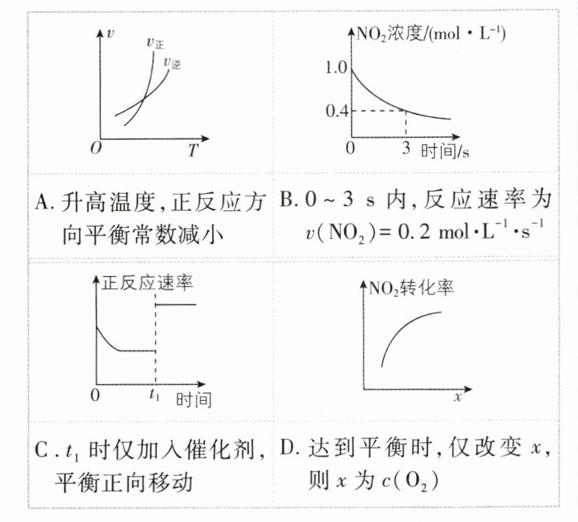 【解析】由图可知,升高温度,正反应速率增大的程度更大,说明升高温度平衡正向移动,正向为吸热反应,所以升高温度正反应方向平衡常数增大,A错误;0~3 s内,NO₂的浓度变化了1 mol·L⁻¹ - 0.4 mol·L⁻¹ = 0.6 mol·L⁻¹,反应速率为$v(NO₂)=\frac{\Delta c(NO₂)}{\Delta t}=\frac{0.6 mol·L⁻¹}{3 s}=0.2 mol·L⁻¹·s⁻¹$,B正确;加入催化剂,平衡不移动,C错误;达到平衡时,仅增大c(O₂),平衡向逆反应方向移动,二氧化氮转化率降低,D错误。