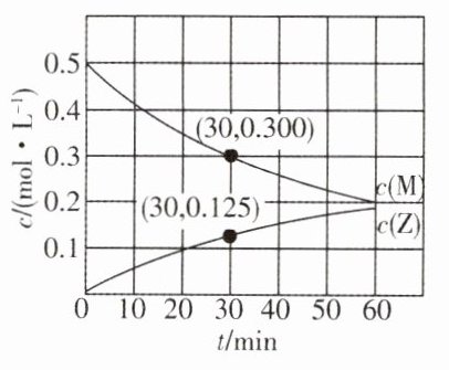 思路导引 由图可知M的起始浓度为0.5 mol·L⁻¹,反应①的速率$v₁ = k₁c²(M)$,反应②的速率$v₂ = k₂c²(M)$,k₁、k₂为速率常数,则同一反应体系中反应①②的速率之比始终不变,所以Y、Z的浓度变化之比始终不变;体系中同时发生反应①M + N = X + Y、②M + N = X + Z,则体系中始终有c(Y)+c(Z)=Δc(M),由图可知30 min时Δc(M)=0.5 mol·L⁻¹ - 0.300 mol·L⁻¹ = 0.2 mol·L⁻¹,c(Z)=0.125 mol·L⁻¹,则c(Y)=0.2 mol·L⁻¹ - 0.125 mol·L⁻¹ = 0.075 mol·L⁻¹,即反应开始后,体系中Y和Z的浓度之比为0.075 mol·L⁻¹ : 0.125 mol·L⁻¹ = 3:5;结合反应的活化能与反应速率关系比较反应①②的活化能大小,根据$v=\frac{\Delta c}{\Delta t}$和转化率公式计算反应速率和转化率。