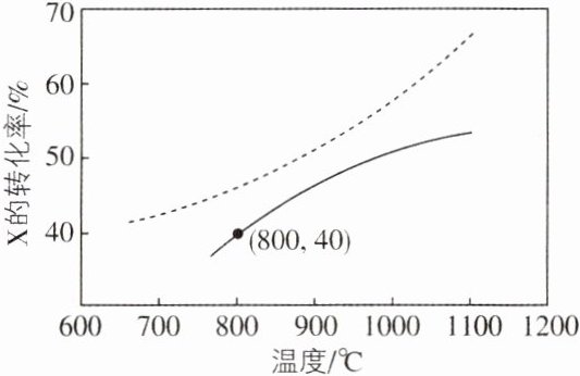 【解析】根据图像可知,虚线表示平衡转化率,随温度升高,X的平衡转化率增大,根据勒夏特列原理,可知该反应正反应为吸热反应,即ΔH>0,A错误;给定的反应中,焓变只与反应体系的始、终态有关,催化剂可以改变活化能,不能改变焓变和平衡转化率,B错误;该反应为气体物质的量增大反应,增大起始压强,相当于在等效平衡的基础上发生平衡逆向移动,X的平衡转化率降低,C错误;该时间段内,用X表示变化的压强为0.4p kPa,则Y变化的压强为0.4p kPa,根据化学反应速率的定义,$v(Y)=\frac{0.4p kPa}{t s}=\frac{0.4p}{t} kPa·s⁻¹$,D正确。