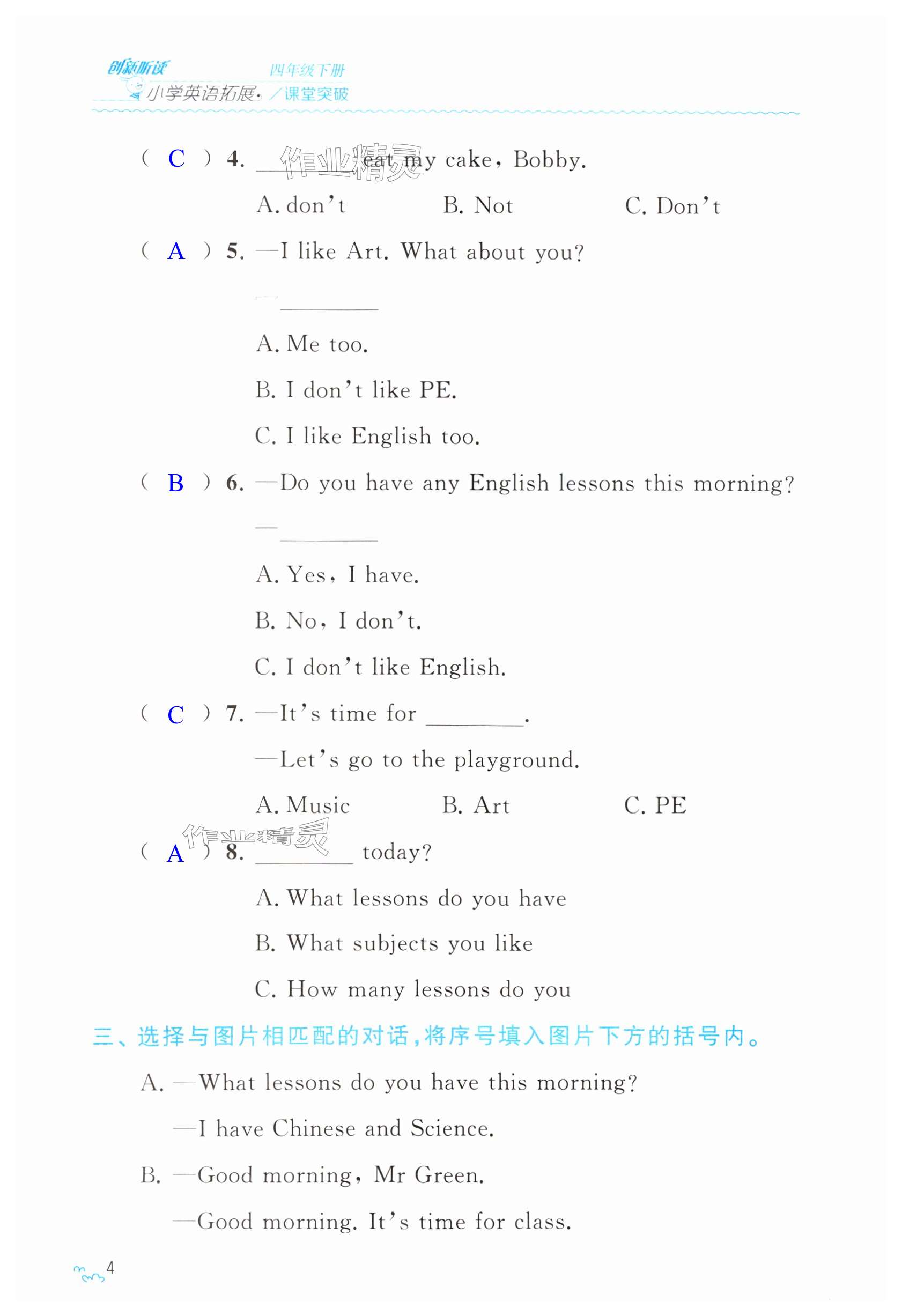 注:目前有些书本章节名称可能整理的还不是很完善,但都是按照顺序排列的,请同学们按照顺序仔细查找。练习册 2025年小学拓展课堂突破四年级英语下册译林版 答案主要是用来给同学们做完题方便对答案用的,请勿直接抄袭。