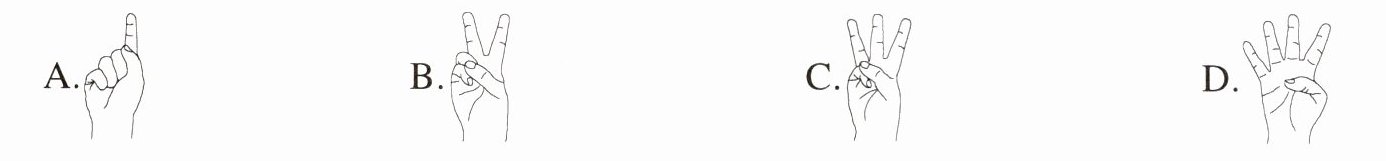 2. B 细节理解题。根据第二段第四句“I did so by holding up two fingers, similar to the ‘victory' or ‘peace' gesture in the United States.”可知,作者在面包店所做的手势是“举起两根手指”,即图B所示。故选B。
