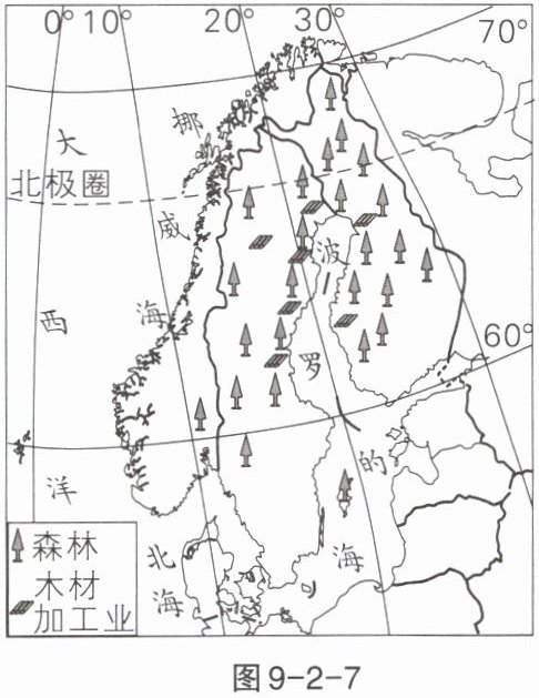 图 9 - 2 - 7 为“世界某地区森林木材加工分布示意图”。读图,完成 15~16 题。