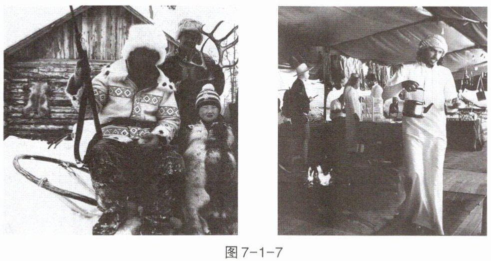 [2023·山东泰安(有删改)]一般来说,世界各地区的人类活动与当地的自然环境、民族习俗等有着密切的联系。图 7-1-7 为两个地区的居民生活差异图。图左为生活在东西伯利亚的雅库特人,居住木屋,身着毛皮衣,运输工具是狗拉雪橇。图右为沙特阿拉伯的贝都因人,居住帐篷,身着宽大袍子,过着游牧生活。据此完成 1~3 题。