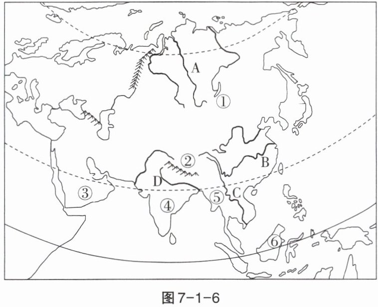 16. 读图 7-1-6“亚洲地区图”,回答下列问题。