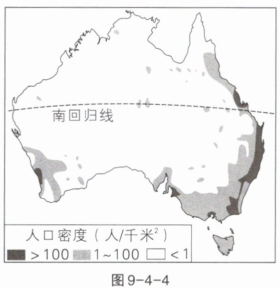 【解析】:6. 读图9-4-4可知,澳大利亚人口密度高的地区(大于100人/平方千米)主要分布在东部和东南部沿海地区。这些地区气候适宜,交通便利,开发历史较早,经济发达,吸引了大量人口聚集。而西部和东北部、西部和西南部、东部和西北部的人口密度相对较低。