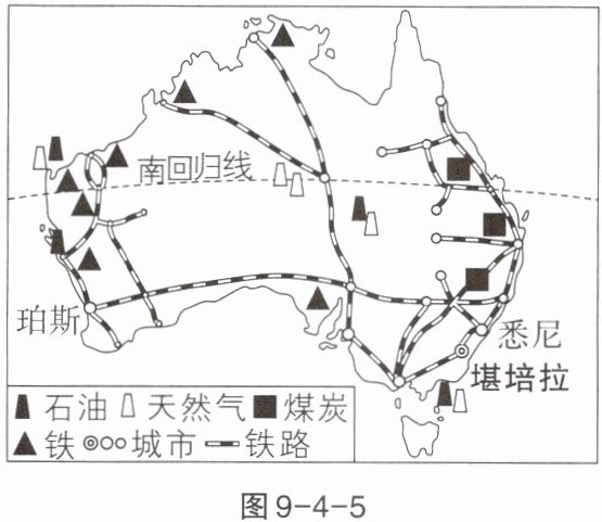 8. 从图9-4-5中可以看到,澳大利亚的铁路线主要分布在矿产资源丰富的地区,如西部和南部的铁矿、煤矿产区,铁路便于矿产资源的运输;同时铁路线也连接了众多人口、城市分布的地区,满足人们的出行和物资运输需求。纬度位置对铁路线分布影响不明显,图中铁路线分布与河流关系也不大。