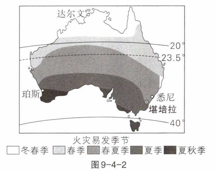 【解析】:4. 读图9-4-2可知,澳大利亚火灾易发季节分布如下:冬春季主要在北部达尔文附近(白色区域);春季在其南部(浅灰色区域);春夏秋季分布范围较广(灰色区域),覆盖了澳大利亚中南部大部分地区;夏季火灾主要在东南部和西南部沿海(深灰色区域);夏秋季仅在西南部珀斯附近小范围分布(黑色区域)。