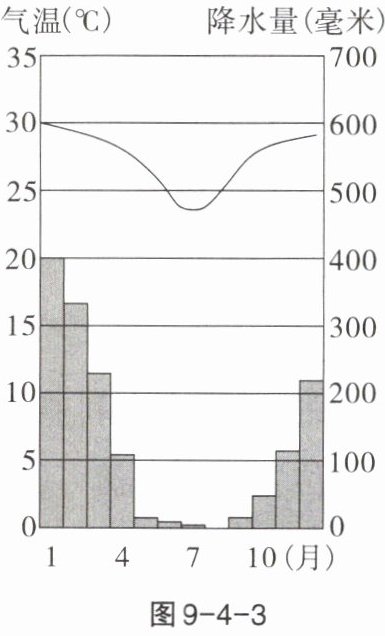 )A.降水较多,气温较高 B.降水较少,气温在20°C以上