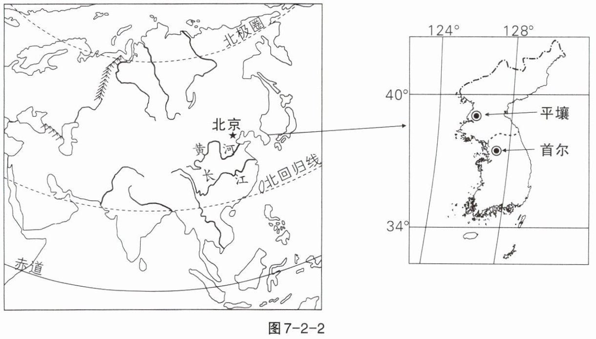 2021年7月2日,联合国第68届贸易和发展理事会通过韩国地位变更案,正式将韩国认定为发达国家。读图7-2-2“亚洲地理分区图、朝鲜半岛略图”完成3~5题。