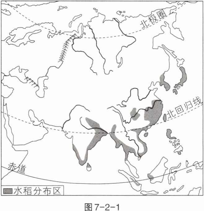 水稻喜温喜湿,生长期需水量为700-1200毫米。目前世界水稻主产区集中于亚洲,而亚洲居民喜食稻米,故水稻也被称为“亚洲的粮食”。读图7-2-1“亚洲水稻分布示意图”,完成1~2题。