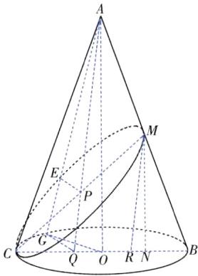 如图,由题可得,圆锥的轴截面是等腰三角形ABC,(题眼)其腰长AC=AB=12,底边BC=8。设O是圆锥底面的圆心,M为AB的中点,过点M作MN⊥BC于点N,则N为OB的中点,所以CN=6。连接AO,CM,易得AO=8$\sqrt{2}$,MN=4$\sqrt{2}$,所以CM=2$\sqrt{17}$。设P为CM的中点,EP为椭圆的短半轴,则根据椭圆的对称性及圆锥的结构特征可知EP与圆锥的底面平行,设AP∩BC=Q,AE交圆O于点G,过点M作MR//AQ交BC于点R,连接GQ,则可知EP⊥CM,EP⊥AO,EP//GQ,所以EP⊥平面ABC,所以EP⊥BC,从而GQ⊥BC。此时有CQ=QR=RB=$\frac{1}{3}$BC=$\frac{8}{3}$,QO=$\frac{4}{3}$,连接OG,则GQ=$\sqrt{OG² - OQ²}$=$\frac{8\sqrt{2}}{3}$。因为PQ=$\frac{1}{2}$MR=$\frac{1}{4}$AQ,所以AP=$\frac{3}{4}$AQ,因为EP//GQ,所以EP=$\frac{3}{4}$GQ=2$\sqrt{2}$,所以该椭圆的半焦距为$\sqrt{(\frac{2\sqrt{17}}{2})² - (2\sqrt{2})²}$=3,所以该椭圆的离心率e=$\frac{3}{\sqrt{17}}$=$\frac{3\sqrt{17}}{17}$。