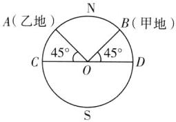 的连线与赤道面所成的角为45°,即∠BOD = 45°,同理可得∠AOC = 45°,所以∠AOB = 90° = $\frac{\pi}{2}$ rad,因此甲、乙两地的球面距离即劣弧AB = $\frac{\pi}{2}$R,故选C。