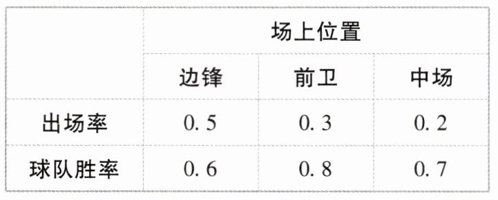 9. [福建泉州2023高二月考]某足球队为评估球员的场上作用,对球员进行数据分析. 球员甲在场上担任边锋、前卫、中场三个位置,根据过往多场比赛,其出场率与出场时球队的胜率如下表所示.