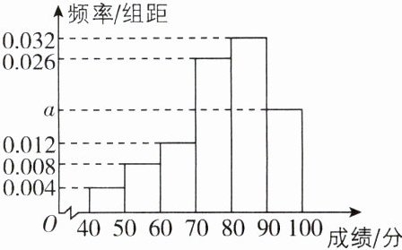 (1)由频率分布直方图中条形图的面积所表示的频率之和为 1 得 $10\times(0.004 + 0.008 + 0.012 + a+0.026 + 0.032)=1$,解得 $a = 0.018$。