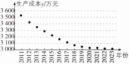 8. [河南商丘部分学校2024高二期末]某科技公司随着技术的进步和管理的逐渐规范,生产成本逐年降低,该公司对2011年至2023年的生产成本$y$(万元)进行统计,根据统计数据作出如图所示的散点图: