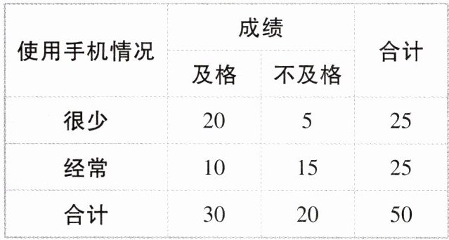 5. [广东实验中学2024高二月考]为了研究经常使用手机是否对数学学习成绩有影响,某校高二数学研究性学习小组进行了调查,随机抽取高二年级50名学生的一次数学单元测试成绩,并制成下面的2×2列联表: