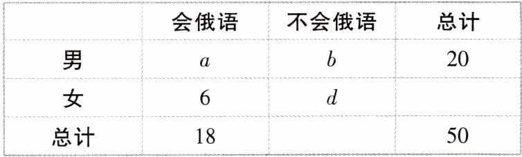 3. 博鳌亚洲论坛2022年年会于4月20日至4月22日在海南博鳌镇举行. 为了搞好对外宣传工作,会务组选聘了50名记者负责对外翻译工作,在下面“性别与会俄语”的2×2列联表中,a - b + d = ________.