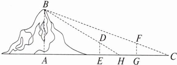 5. (2021·全国乙,理 9)魏晋时期刘徽撰写的《海岛算经》是关于测量的数学著作,其中第一题是测量海岛的高. 如图,点$E$,$H$,$G$在水平线$AC$上,$DE$和$FG$是两个垂直于水平面且等高的测量标杆的高度,称为“表高”,$EG$称为“表距”,$GC$和$EH$都称为“表目距”,$GC$与$EH$的差称为“表目距的差”,则海岛的高$AB =$(