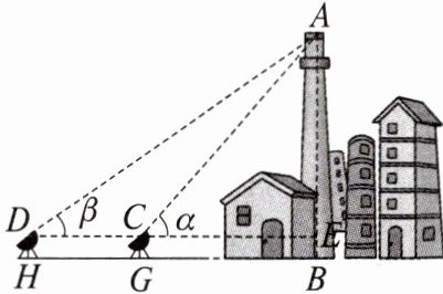 使H,G,B三点在同一条直线上,在G,H两点用测角仪器测得A的仰角分别是$\alpha,\beta$,$CD=a$,测角仪器的高是$h$,那么,在$\triangle ACD$中,由正弦定理,得$AC=\frac{a\sin\beta}{\sin(\alpha - \beta)}$。所以,这座建筑物的高度为$AB=AE + h=AC\sin\alpha + h=\frac{a\sin\alpha\sin\beta}{\sin(\alpha - \beta)}+h$。