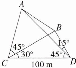 2. 如图所示,$A$,$B$是某沼泽地上不便到达的两点,$C$,$D$是可到达的两点. 已知$A$,$B$,$C$,$D$ 4 点都在水平面上,而且已经测得$\angle ACB = 45^{\circ}$,$\angle BCD = 30^{\circ}$,$\angle CDA = 45^{\circ}$,$\angle BDA = 15^{\circ}$,$CD = 100$ m,则$AB$的长为