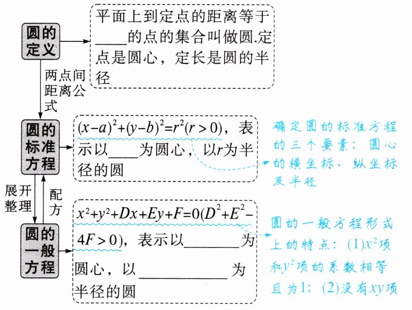 微点拨:方程$x^2 + y^2 + Dx + Ey + F = 0$,当$D^2 + E^2 - 4F > 0$时,表示圆心为$(-\frac{D}{2}, -\frac{E}{2})$,半径$r = \frac{\sqrt{D^2 + E^2 - 4F}}{2}$的圆;当$D^2 + E^2 - 4F = 0$时,表示一个点$(-\frac{D}{2}, -\frac{E}{2})$;当$D^2 + E^2 - 4F < 0$时,不表示任何图形.