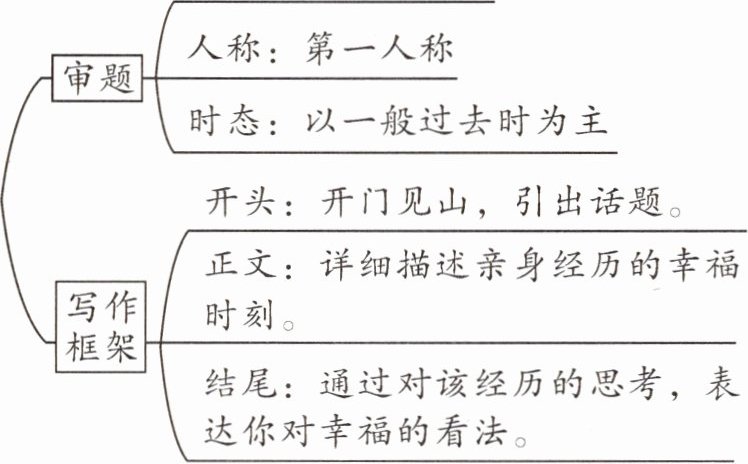 本单元话题主要围绕“幸福的秘诀”展开,要求同学们能用所学的词汇、语法和句型介绍自己所经历的幸福时刻,并谈一谈自己对幸福的理解。写作时要注意详细描述幸福时刻,并且能够升华主题,认识到幸福的本质。
