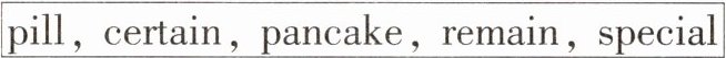 1. certain 2. remained 3. pancakes 4. pill(s) 5. special