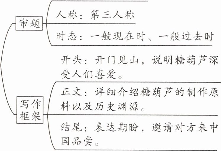 @@One possible version: Dear Linda, You asked me some information about the famous snack—tanghulu in my country. Let me tell you something about it. Tanghulu tastes sweet and delicious. It is usually made of sugar and haws. In some places, people also use strawberries, grapes, and even little apples to make it. It is so delicious and healthy that many Chinese people like eating it. It is said that tanghulu ever cured the disease of an emperor’s wife in the Song Dynasty. People believe it is a symbol of happiness and reunion. Do you look forward to tasting it? Come to my country, and I’ll treat you to tanghulu. Yours, Han Mei