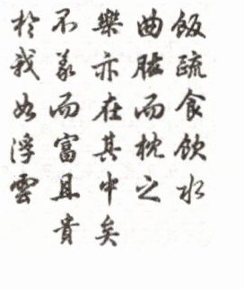 Think about this: You eat 杅不鑿曲飯 菽羮亦膾疏 如而在而食 泔寠其枕飲 甞且中之水 青矣 simple food every day. You can’t have milk tea or other soft drinks. When you sleep, you have no pillows(枕头). How long could you live such a life? Many of us might not be able to live this way for very long. But Confucius said that such a life was not painful for him at all. Instead, he enjoyed it.